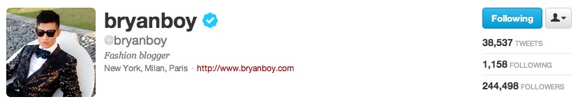 He has 244,505 followers and a cool blog – bryanboy.com